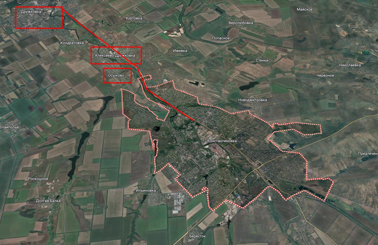 Основная зона поражения сосредоточена на северной окраине Константиновки, в районе Осыково и Алексеево-Дружковки, при этом всё чаще удары наносятся ещё севернее — в районе Дружковки. Российские беспилотники различных модификаций непрерывно патрулируют центральную дорогу, поражая любые цели: от небольших групп пехоты до грузового автотранспорта. Ожидается, что ситуация продолжит неуклонно ухудшаться с предсказуемыми для гарнизона последствиями.