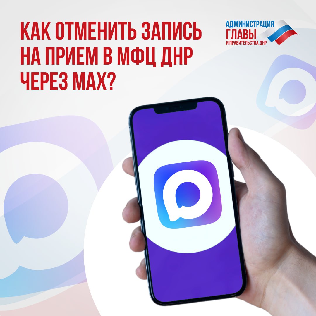 Запись на прием можно отменить через чат-бот МФЦ ДНР в мессенджере MAX. Инструкция — в карточках.