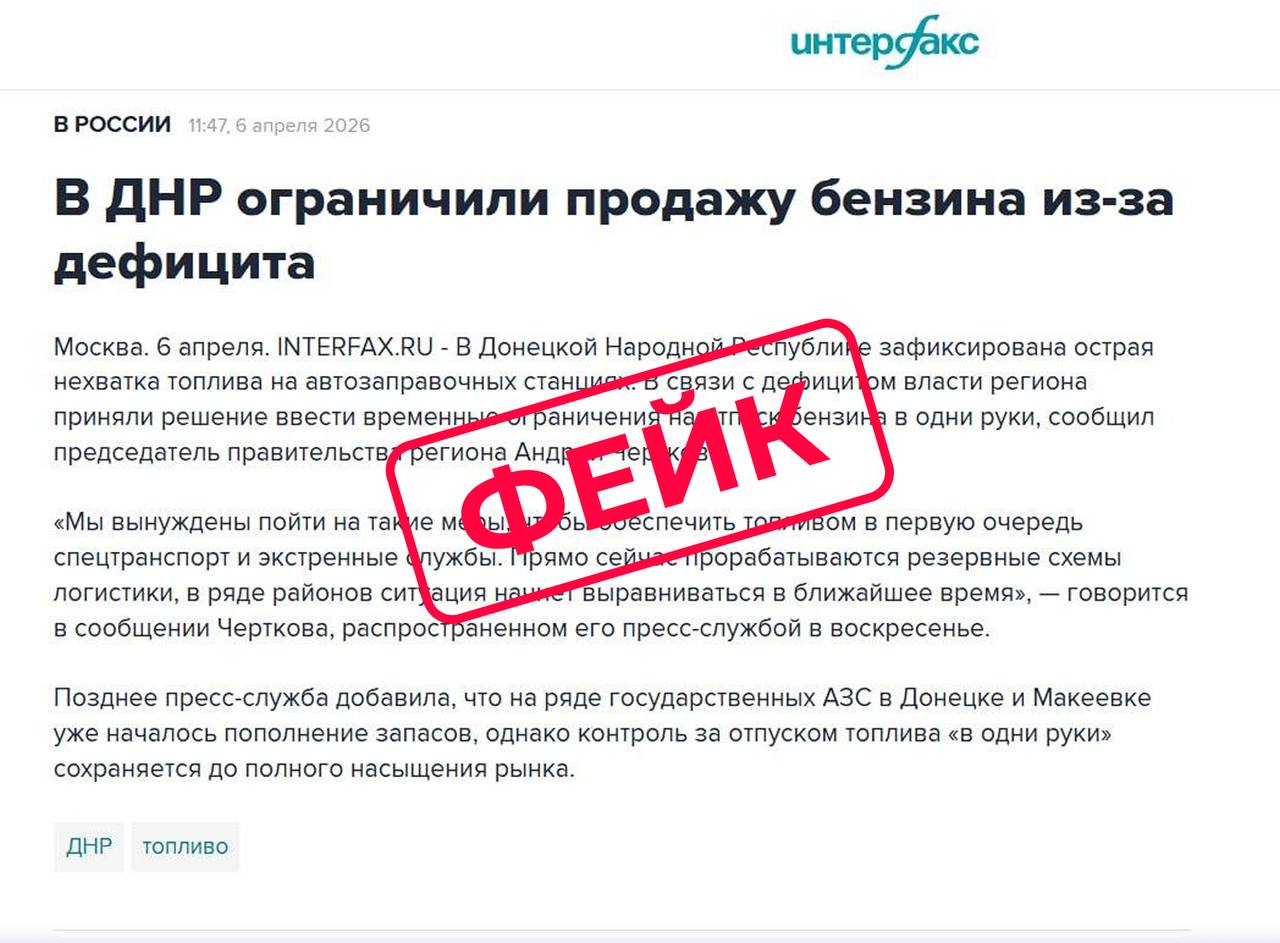 Авторы поста ссылаются на "сообщение" Интерфакса. Но стоит открыть новостную ленту агентства, и становится понятно: такой информации 6 апреля в 11:47 не было.Чтобы проверить, есть ли бензин на наших АЗС, проехались по Донецку. Итог: бензин есть, очередей машин нет. Кто не верит, смотрите видео.