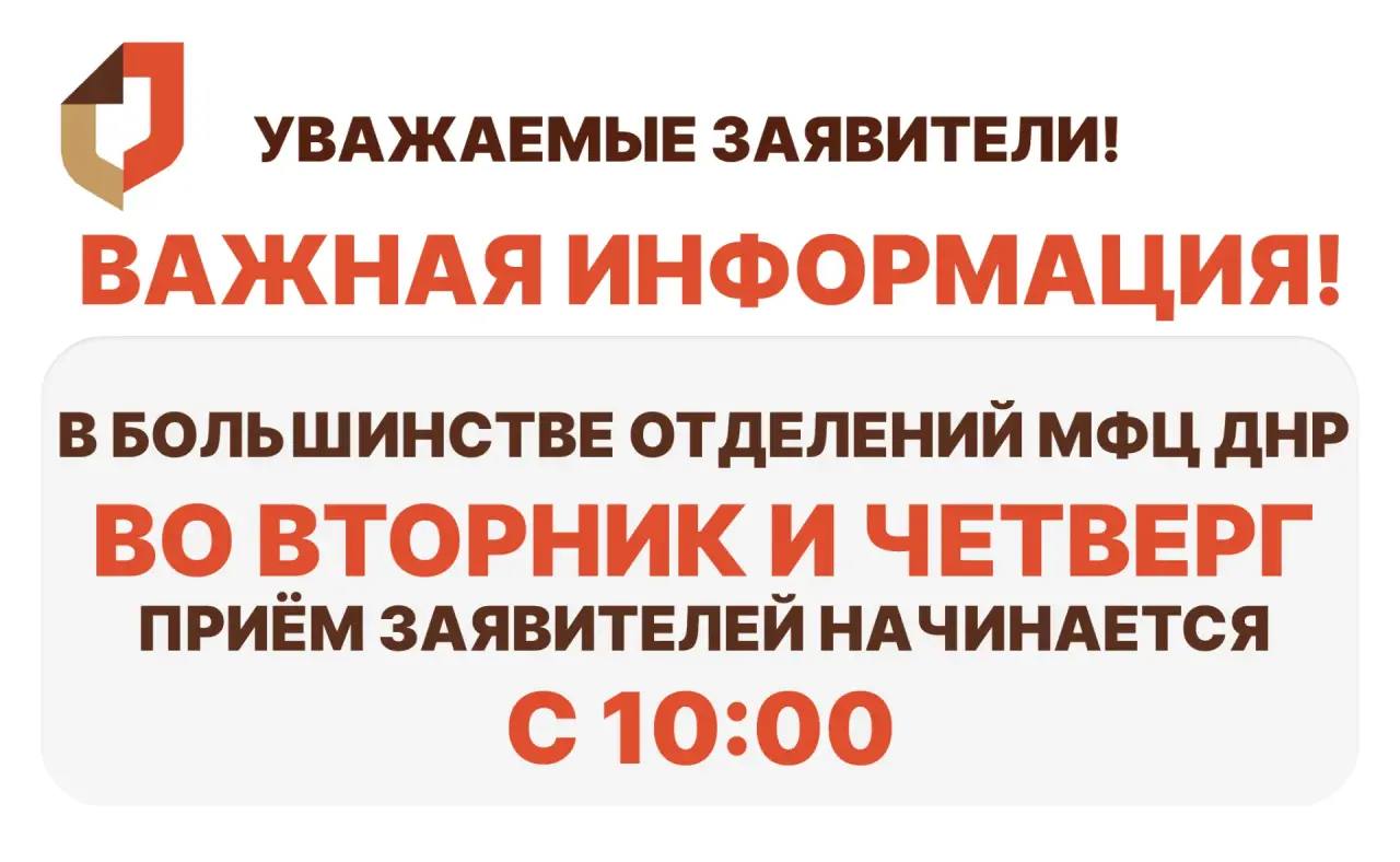 Напоминаем: в большинстве отделений МФЦ ДНР во вторник и четверг приём заявителей начинается с 10:00.
