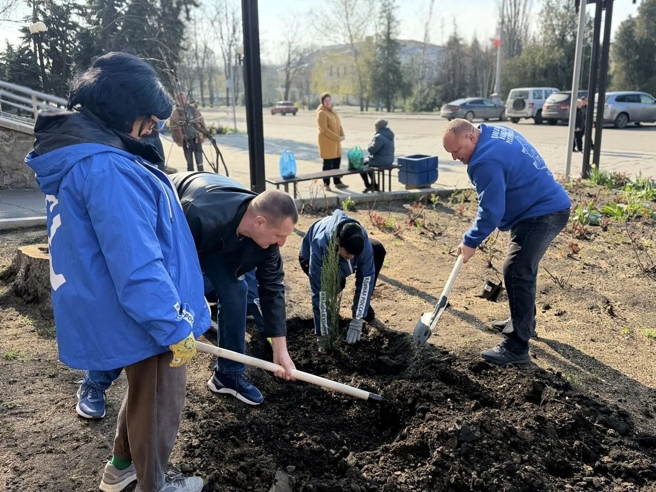 Общими усилиями участников субботника были высажены новые зеленые насаждения у городских памятников: теперь территории мемориалов украшают молодые туи и кусты роз.