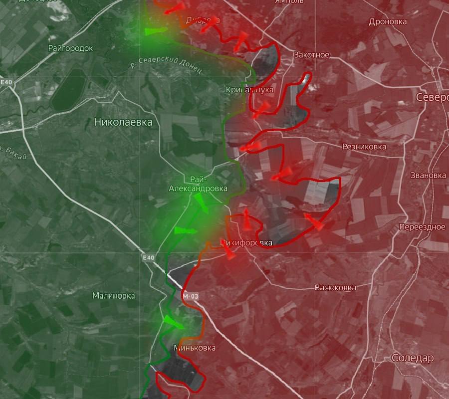 «На Славянском направлении российские войска выходят к водоразделу Бахмутки и Казённого Торца. Продвижении ВС РФ идет по линии Николаевка – Рай-Александровка».