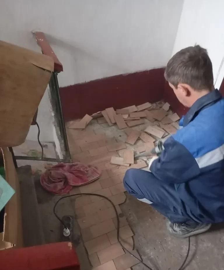 Бригада из 5 специалистов региона-шефа в подъезде дома № 63 по улице Узловой провела демонтаж плитки, нанесла шпатлевку, а также удалила старые окна для их замены на новые пластиковые.