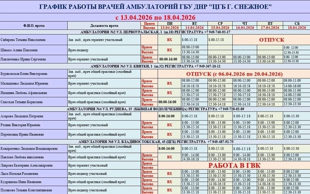 График работы врачей ГБУ ДНР «ЦГБ г. Снежное».