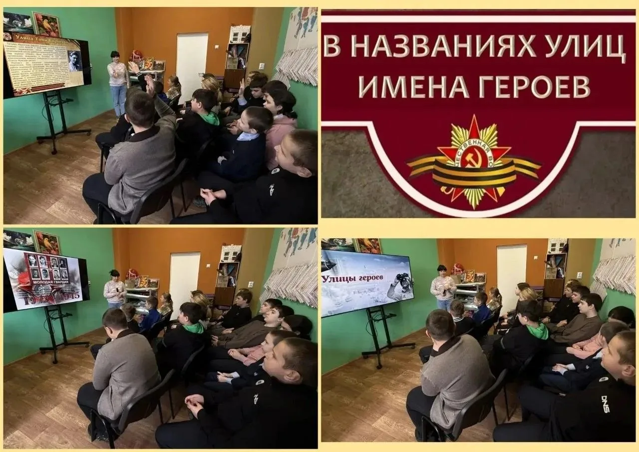 В начале мероприятия ведущая рассказала о героях Великой Отечественной войны, в честь которых названы улицы Суворова, Тани Бирлевой, Молодой Гвардии, Кошевого и др. Ребята узнали много нового об именах тех людей, в честь которых названы улицы, так как в каждом названии — чья-то судьба, героический подвиг, самопожертвование во имя Родины, ради жизни будущих поколений.