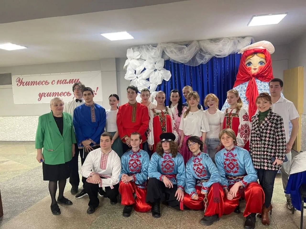 Студенты подготовили яркое и насыщенное праздничное шоу. Они поздравили гостей с праздником, подарили школьникам красочные праздничные номера с зажигательными народными танцами и песнями.