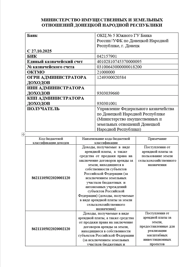 В связи с внесением изменений в наименование Банка, оплату арендной платы в бюджет Донецкой Народной Республики, в размере, установленном договорами аренды, необходимо осуществлять по следующим реквизитам.