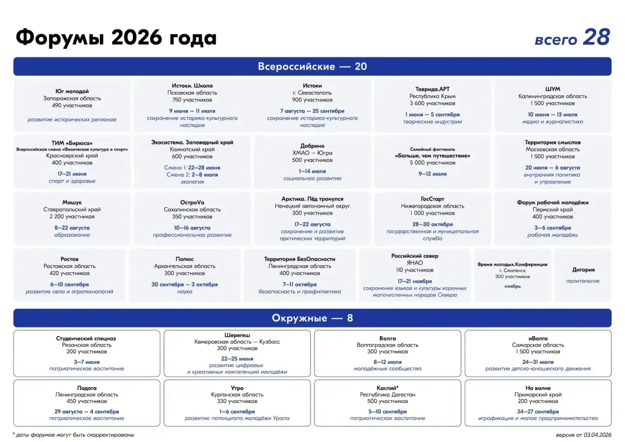 В рамках реализации национального проекта «Молодёжь и дети» инициированного Президентом России, стартует масштабная форумная кампания от Росмолодёжи. В 2026 году запланировано проведение 28 крупнейших площадок: 20 всероссийских и 8 окружных форумов.