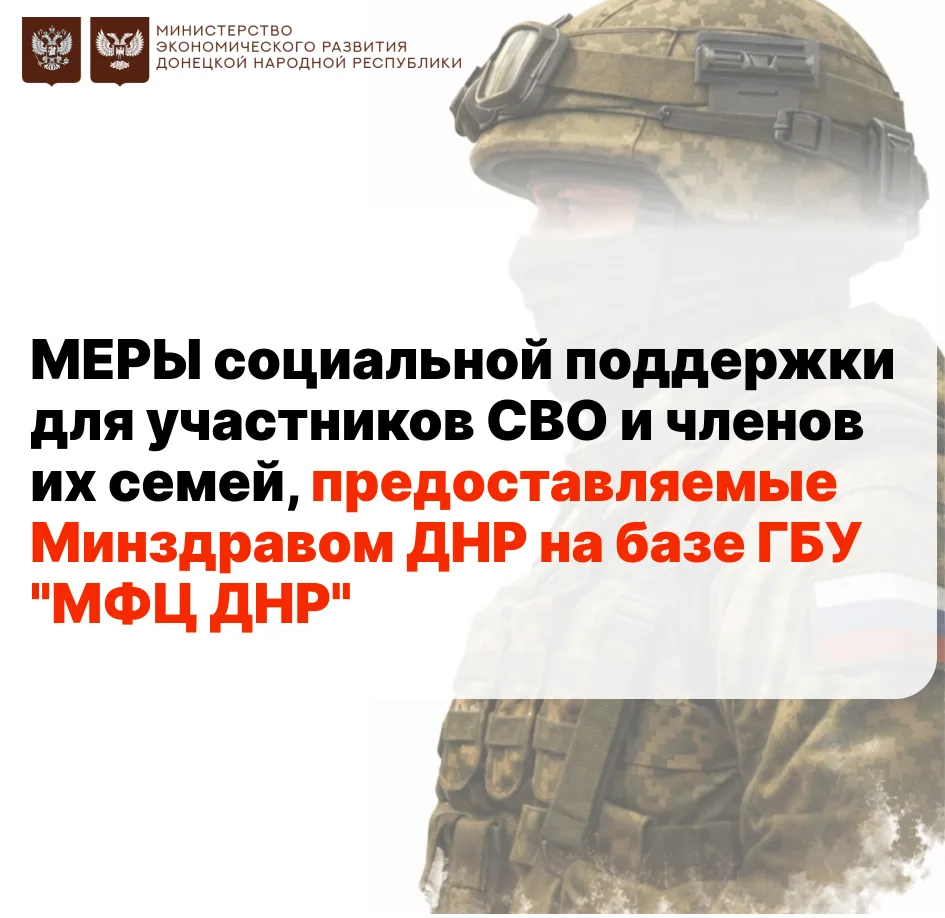 Меры социальной поддержки для участников СВО и членов их семей предоставляемые Минздравом ДНР на базе ГБУ «МФЦ ДНР»