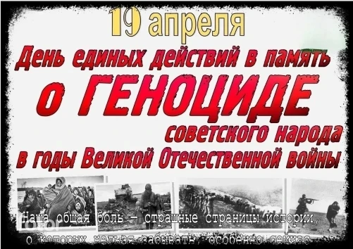 19 апреля "День единых действий в память о геноциде советского народа нацистами и их пособниками в годы Великой Отечественной войны". Эта дата является своеобразным символом единства Красной армии и советского народа в достижении победы над нацистами, устроившими геноцид и на нашей земле.