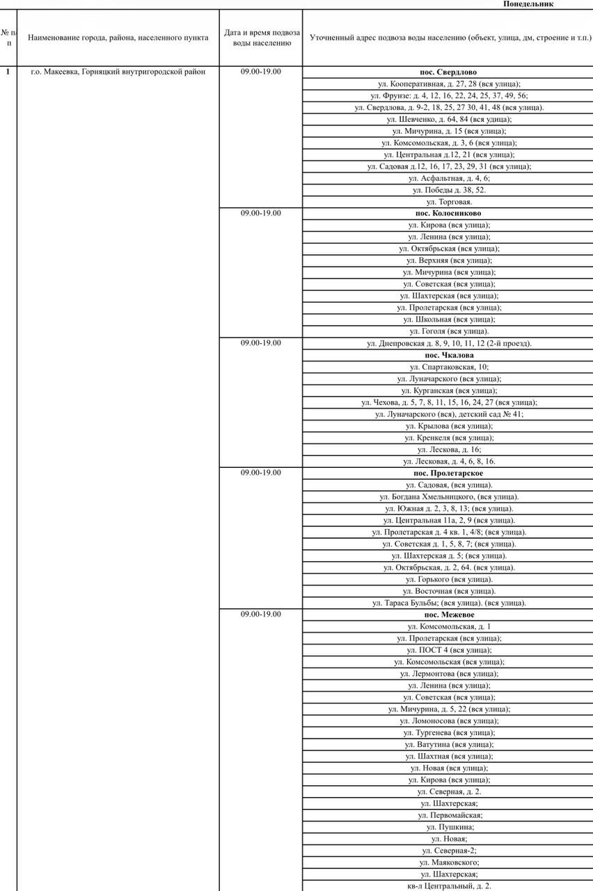 График подвоза воды населению городского округа Макеевка
