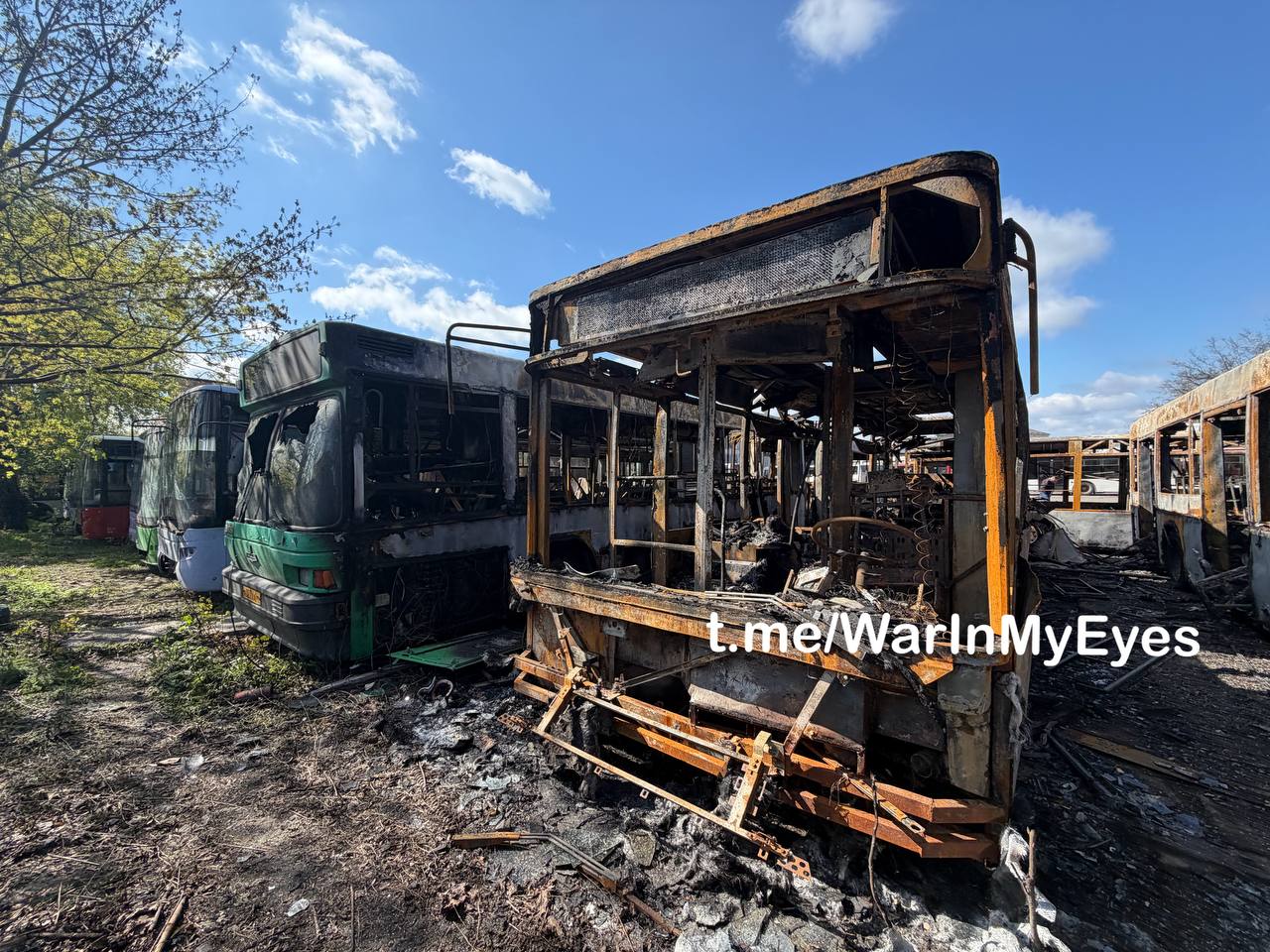 Последствия прилета ударного БПЛА на территорию автотранспортного предприятия в Куйбышевском районе Донецка вчера.