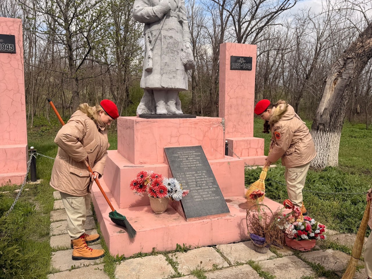 20 апреля юнармейцы военно-патриотического клуба «Пересвет» из города Ждановка проявили свою гражданскую позицию и уважение к подвигу предков, проведя субботник у мемориала «Братская могила» в поселке городского типа Ольховка.