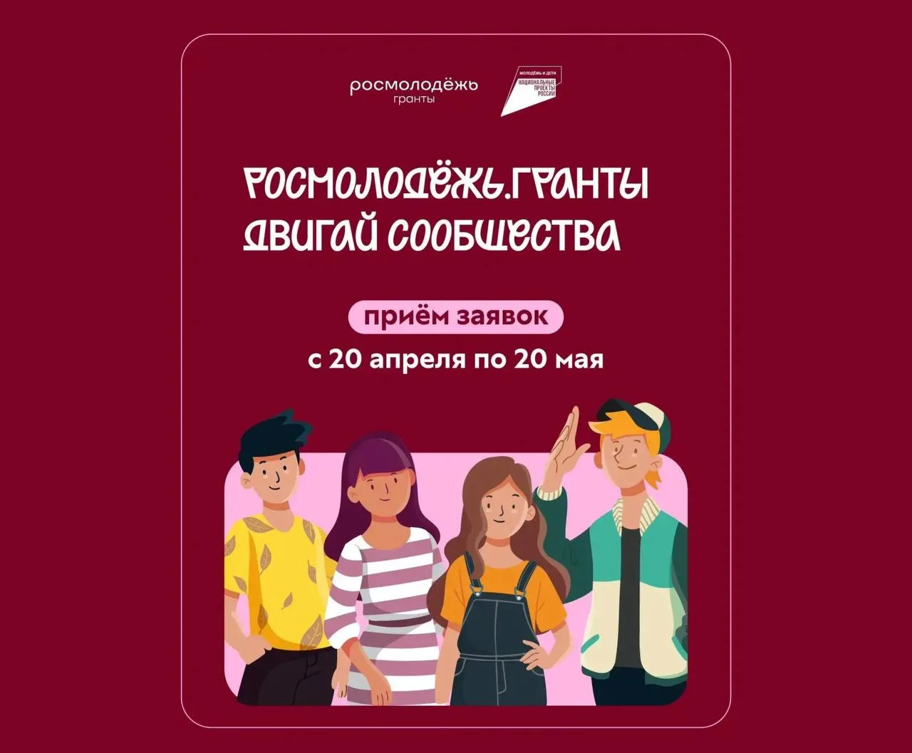 Рекомендованный срок реализации проектов: август 2026 — июль 2027. Конкурс проводится в рамках национального проекта «Молодёжь и дети».