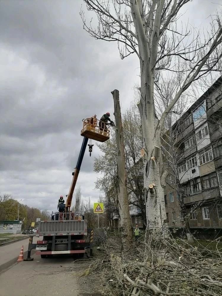 Подрядная организация Самарской области приступила к выполнению работ по капитальному ремонту сетей наружного освещения по ул. 250 лет Донбасса. На сегодняшний день бригада рабочих выполняет работы по опиловке ветвей деревьев.