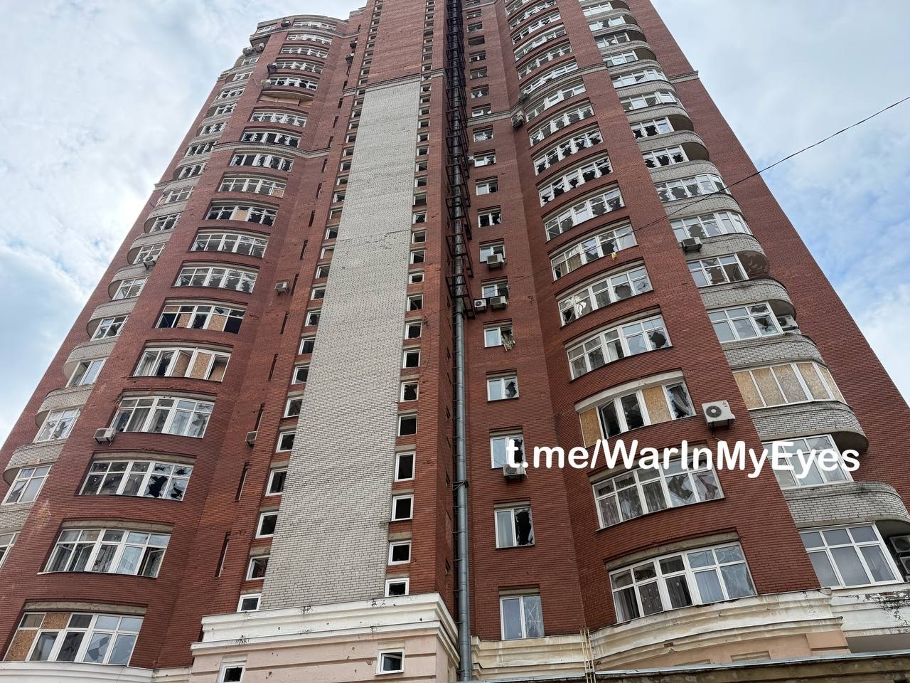 Последствия прилета ударных БПЛА самолетного типа в Ворошиловском районе Донецка, поврежден ряд многоквартирных домов и более 15 автомобилей.