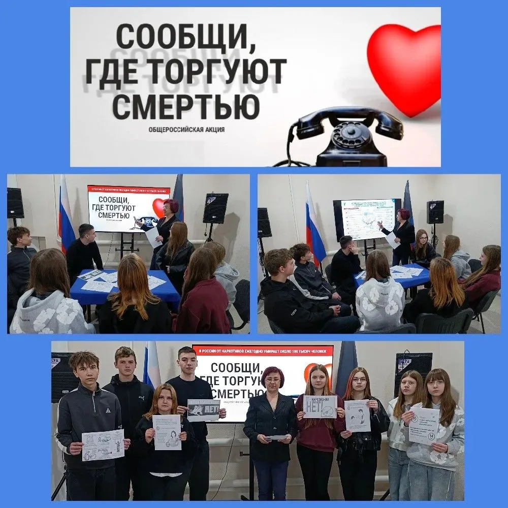 В целях создания в обществе осознанного негативного отношения к незаконному потреблению наркотических средств и психотропных веществ, 23 апреля МБУ «Клуб им. Пушкина г.о. Торез» присоединился к общероссийской акции «Сообщи, где торгуют смертью». Ребята старших классов узнали о видах юридической ответственности, и о том, как сообщить о фактах незаконного оборота наркотиков.