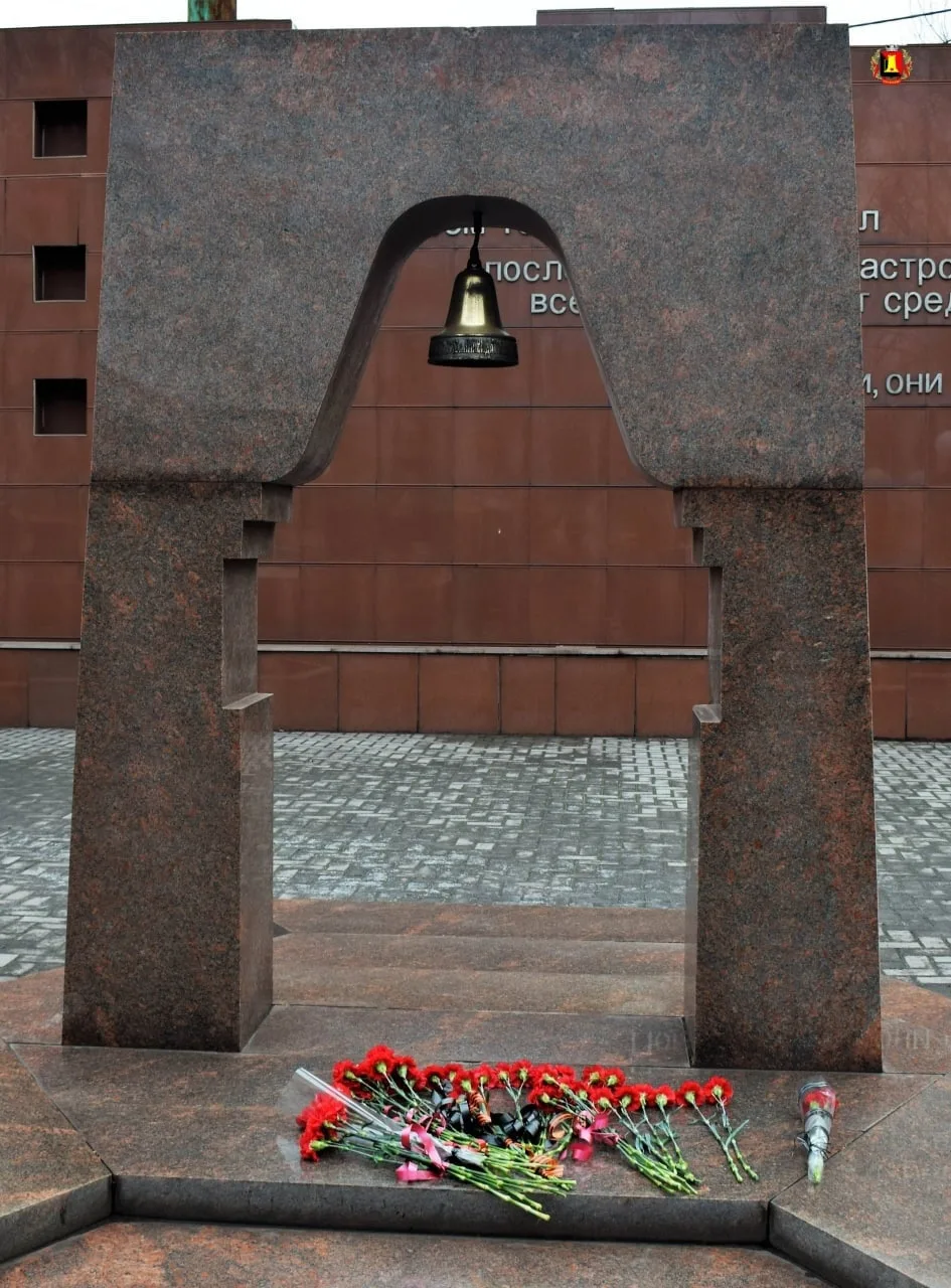 Перед стеной — розовогранитный монумент в виде храма и бронзовый колокол Памяти и Скорби.