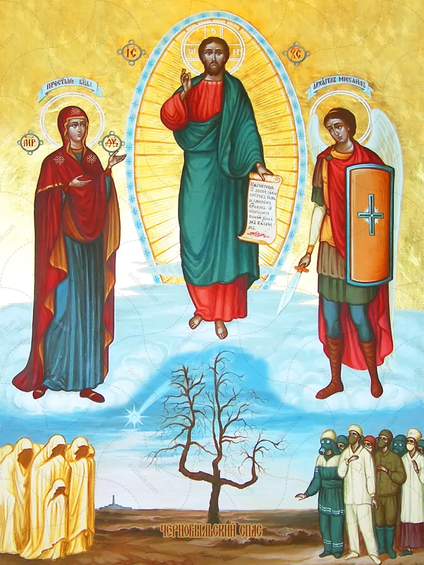 Композиция иконы символична: вверху – Богородица, Христос и Архистратиг Михаил – он ведет человеческую Божью рать живых и мертвых «чернобыльцев».