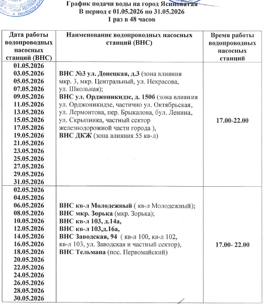 График подачи воды на город Ясиноватая в период с 01.05.2026 по 31.05.2026