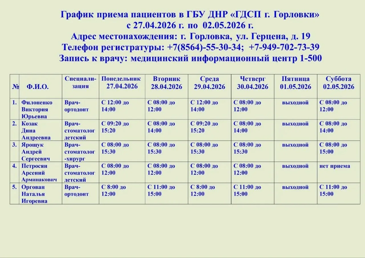 График работы специалистов ГБУ ДНР «ГДСП г.Горловки», ГБУ ДНР «Городской наркологический диспансер г. Горловки», ГБУ ДНР «ГПБ г. Горловки», ГБУ ДНР «ГПТД г.Горловки», ГБУ ДНР «ГДВД г.Горловки», ГБУ ДНР «ГСП г.Горловки», ГБУ ДНР «ГОД г. Горловки», ГБУ ДНР «ГСП № 4 г.Горловки», ГБУ ДНР «ЦОМД г. Горловки»