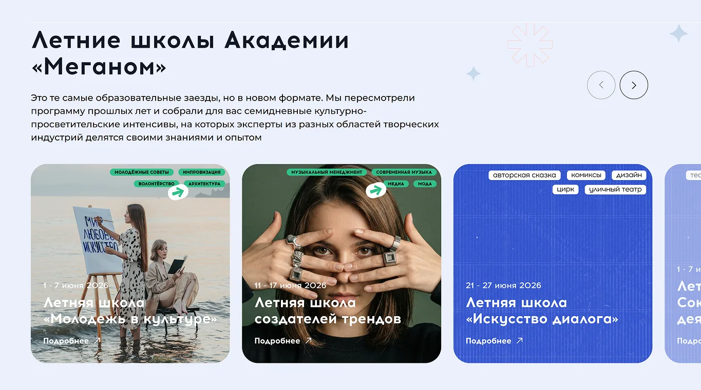 Это те самые образовательные заезды, но в новом формате. Мы пересмотрели программу прошлых лет и собрали для вас семидневные культурно-просветительские интенсивы, на которых эксперты из разных областей творческих индустрий делятся своими знаниями и опытом.