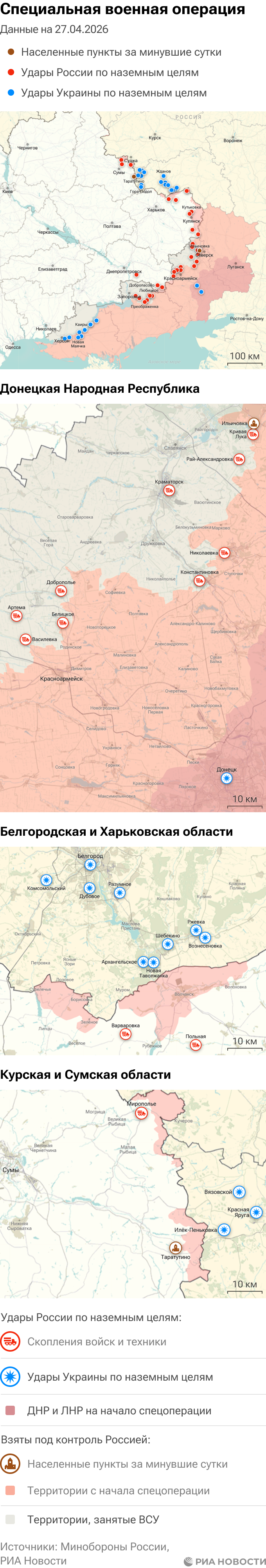Российская армия с 24 февраля 2022 года проводит на Украине специальную военную операцию. Ее главной целью является помощь Донецкой и Луганской народным республикам, на территории которых с 2014 года не прекращались обстрелы. Перед российскими военными поставлена задача минимизировать потери личного состава и мирного населения при выполнении боевых заданий.Данные Минобороны и администраций новых регионов на 27 апреля 2026 года