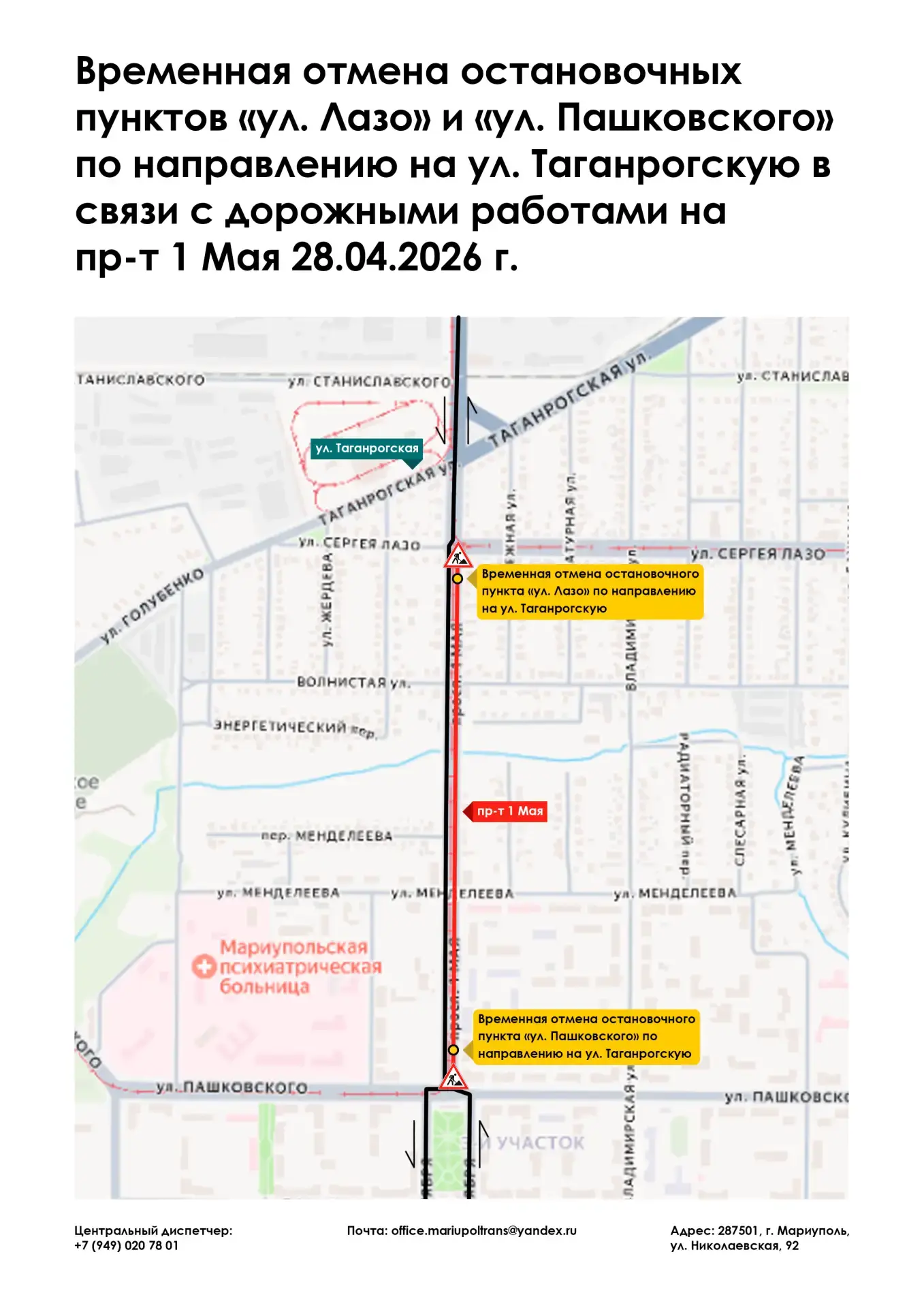Информируем, что 28.04.2026 г. в связи с дорожными работами на пр-т 1 Мая, остановочные пункты «ул. Лазо» и «ул. Пашковского» по направлению на ул. Таганрогскую временно отменяются.