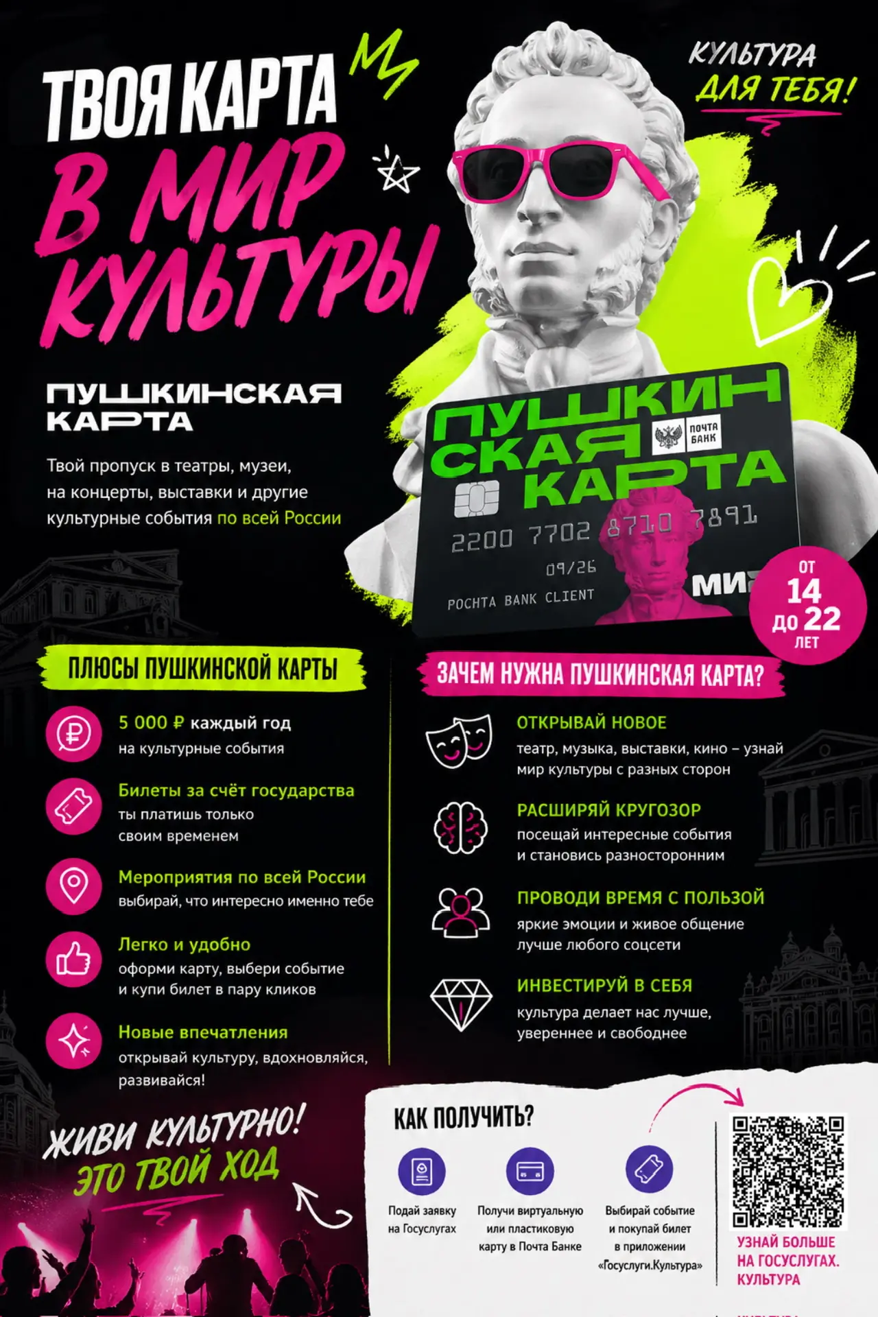 «Пушкинская карта» — это специальная банковская карта, созданная для молодых людей в возрасте от 14 до 22 лет и призванная повысить их интерес к культурно-просветительским мероприятиям.