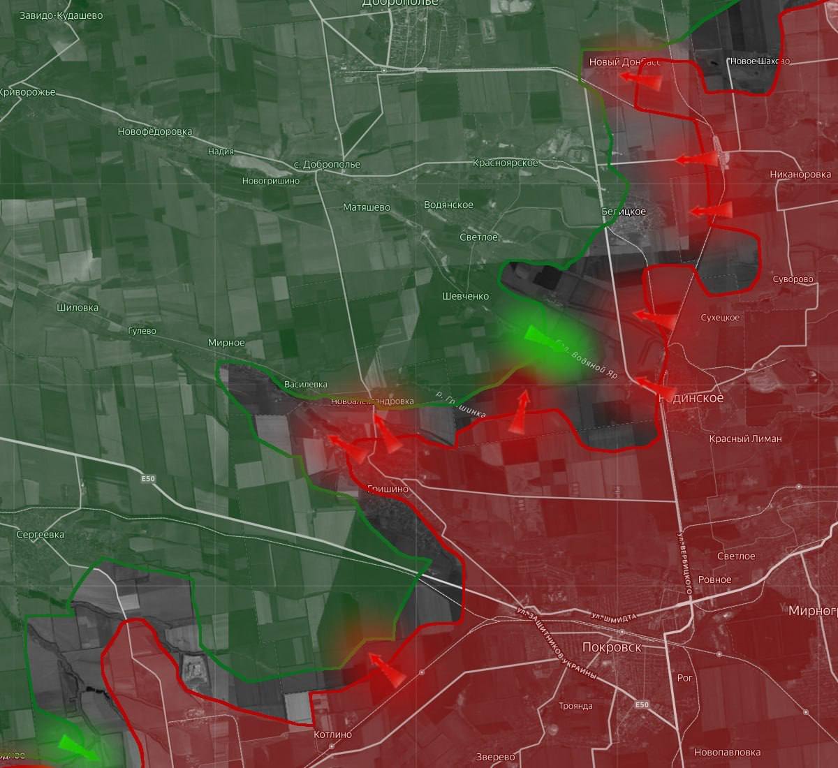 «На Покровском направлении ВС РФ, после захвата Гришино, продвигаются юго-западнее села – в «кармане», который прилегает к трассе Е-50.