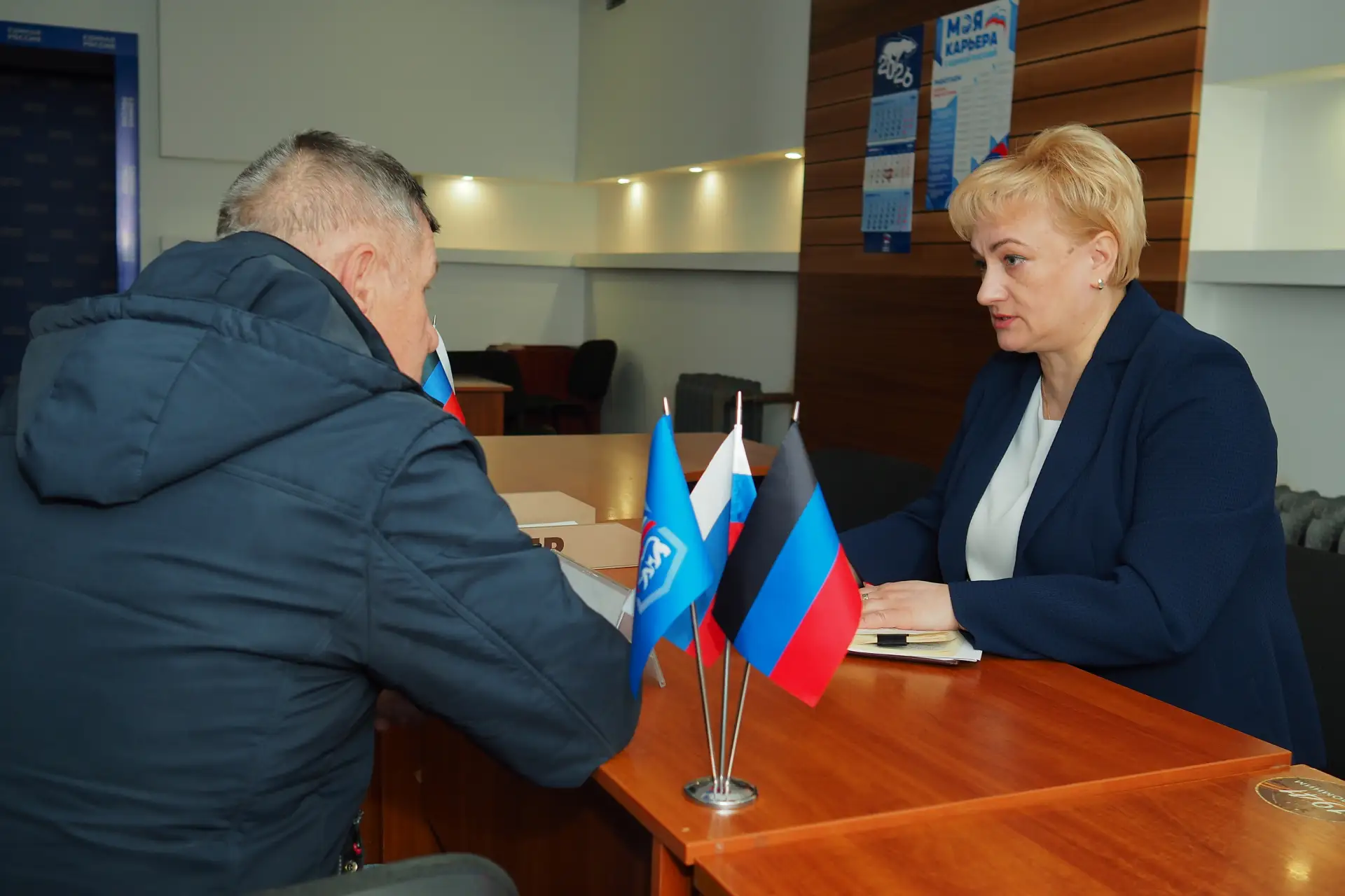В региональной общественной приёмной Единой России прошёл приём депутата НС ДНР Юлии Крюковой. За помощью обратились несколько участников СВО с различными вопросами: бесплатный проезд в общественном транспорте, предоставление региональных льгот, предоставление санитарно-курортных путевок для оздоровления.