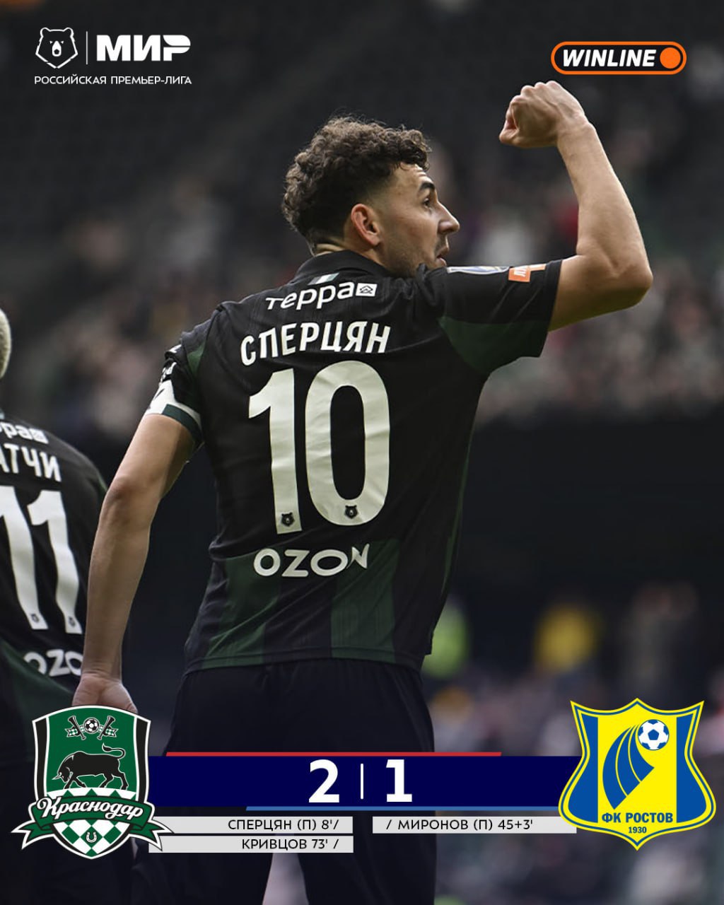 В составе победителей голы забили Эдуард Сперцян (8-я минута, с пенальти) и Никита Кривцов (73). У проигравших отличился Алексей Миронов (45+3, с пенальти).