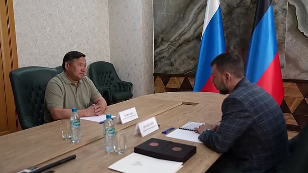 Глава ДНР Денис Пушилин передал главе Тувы Владиславу Ховалыгу Золотые Звезды Героя Республики, которых удостоились два тувинских военнослужащих.
